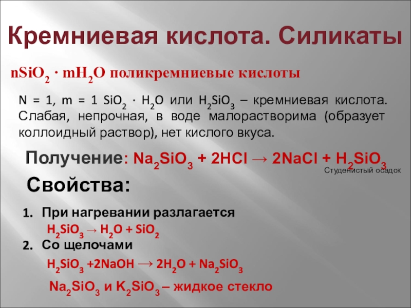 Получение: Na2SiO3 + 2HCl → 2NaCl + H2SiO3