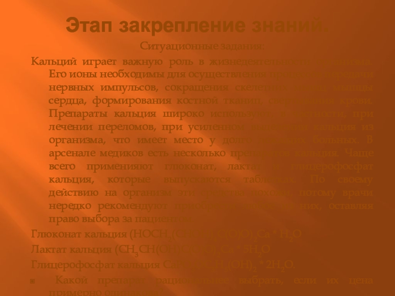 ионы необходимы для осуществления процессов передачи нервных импульсов, сокращения скелетних мышц мышцы сердца, формирования костной тканип, свертывания крови. Препараты кальция широко используют, в частности, при лечении переломов, при усиленном выделении кальция из организма, что имеет место у долго лежащих больных. В арсенале медиков есть несколько препаратов кальция. Чаще всего применияют глюконат, лактат и глицерофосфат кальция, которые выпускаются таблетках. По своему действию на организм эти средства похожи, потому врачи нередко рекомендуют приобрести любое из них, оставляя право выбора за пациентом.