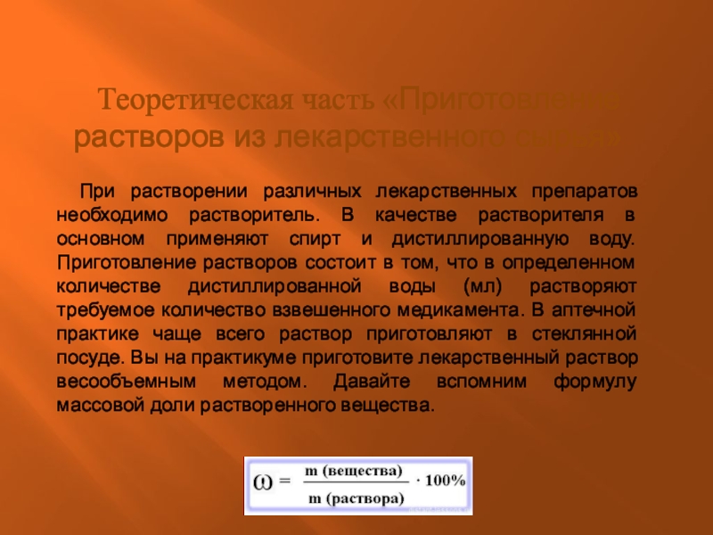 Слайд 18Теоретическая часть «Приготовление растворов из лекарственного сырья»