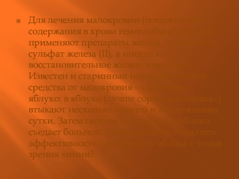 железа, в том числе сульфат железа (II), а иногда и восстановительное железо в порошке. Известен и старинный народный рецепт средства от малокровия – «железное» яблуко: в яблуко (лучше сорта «антоновка») втыкают несколько гвоздей и выдерживают сутки. Затем гвоздик вынимают, а яблоко съедает больной. Как вы можете объяснить эффективность «желейного» яблока с точки зрения химии?