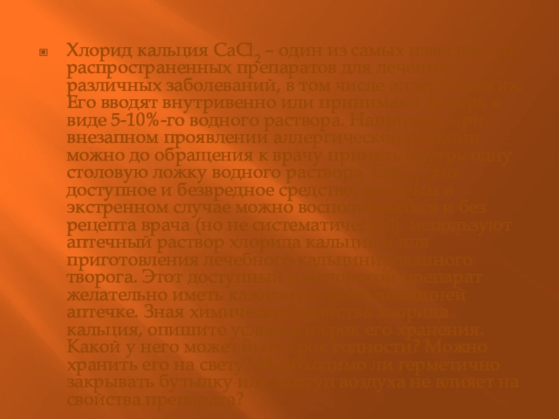 для лечения различных заболеваний, в том числе аллергических. Его вводят внутривенно или принимают внутрь в виде 5-10%-го водного раствора. Например, при внезапном проявлении аллергической реакции можно до обращения к врачу принять внутрь одну столовую ложку водного раствора CaCl2. Это доступное и безвредное средство, которым в экстренном случае можно воспользоваться и без рецепта врача (но не систематически!). используют аптечный раствор хлорида кальция и для приготовления лечебного кальцинированного творога. Этот доступный и недорогой препарат желательно иметь каждому в своей домашней аптечке. Зная химические свойства хлорида кальция, опишите условия и срок его хранения. Какой у него может быть срок годности? Можно хранить его на свету? Необходимо ли герметично закрывать бутылку или доступ воздуха не влияет на свойства препарата?