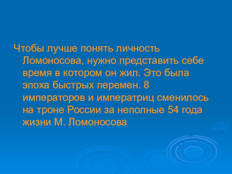 Чтобы лучше понять личность Ломоносова, нужно представить себе время в котором он жил. Это была эпоха быстрых