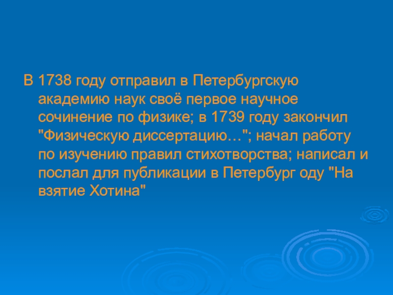 сочинение по физике; в 1739 году закончил "Физическую диссертацию…"; начал работу по изучению правил стихотворства; написал и послал для публикации в Петербург оду "На взятие Хотина"