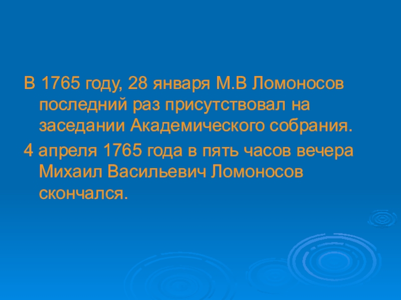 В 1765 году, 28 января М.В Ломоносов последний раз присутствовал на заседании Академического собрания.4 апреля 1765 года