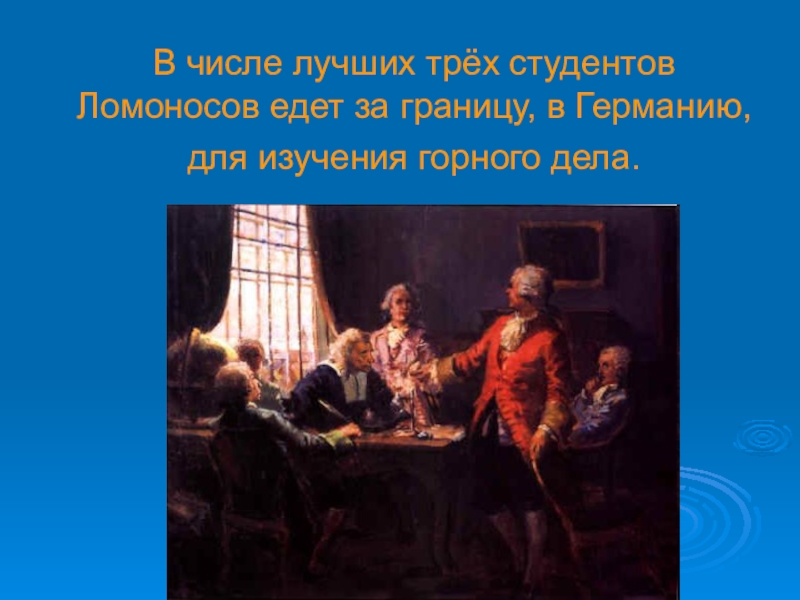 В числе лучших трёх студентов Ломоносов едет за границу, в Германию, для изучения горного дела.