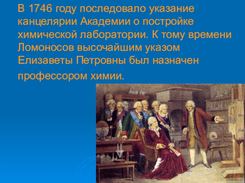 К тому времени Ломоносов высочайшим указом Елизаветы Петровны был назначен профессором химии.