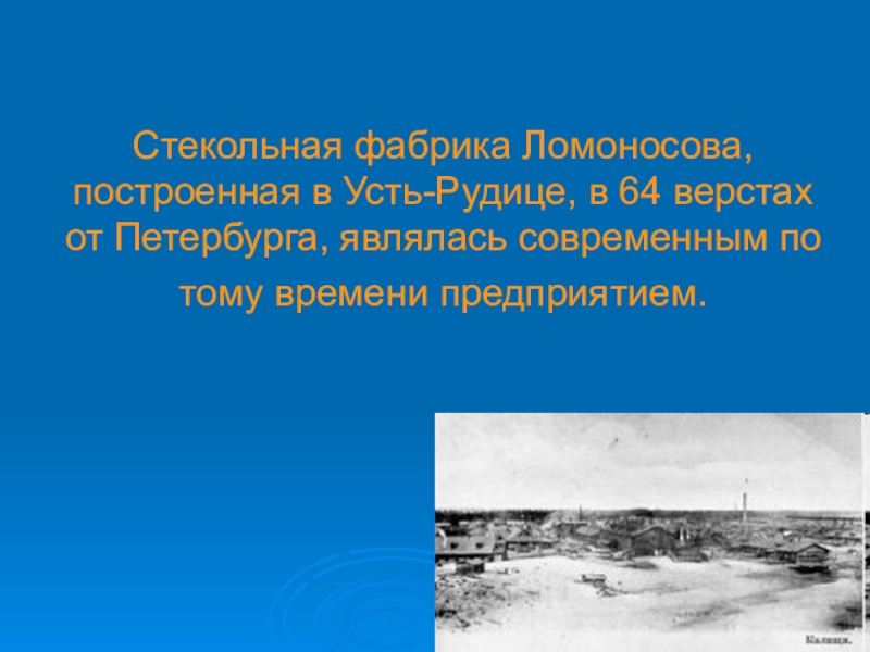 Слайд 16 Стекольная фабрика Ломоносова, построенная в Усть-Рудице, в 64 верстах от Петербурга,