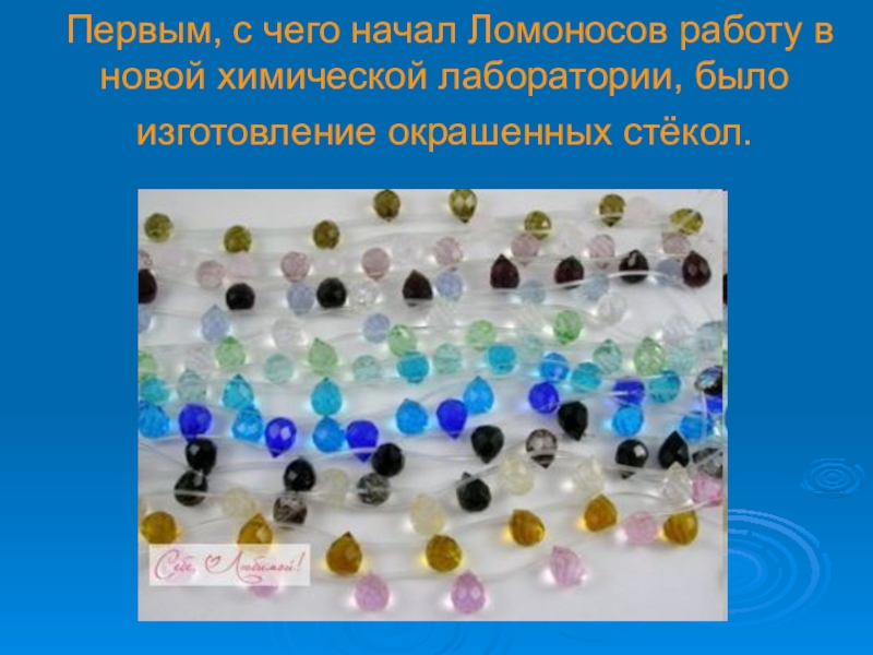 Первым, с чего начал Ломоносов работу в новой химической лаборатории, было изготовление окрашенных стёкол.