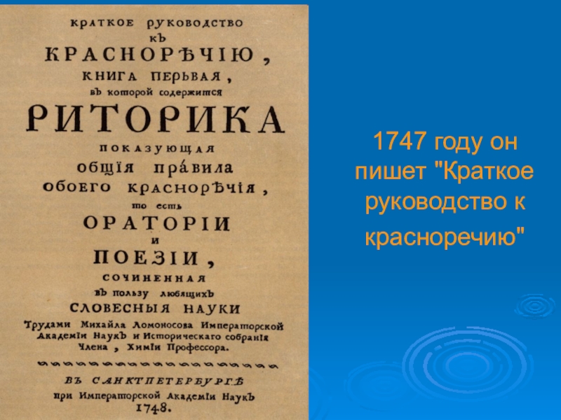 Слайд 231747 году он пишет "Краткое руководство к красноречию"