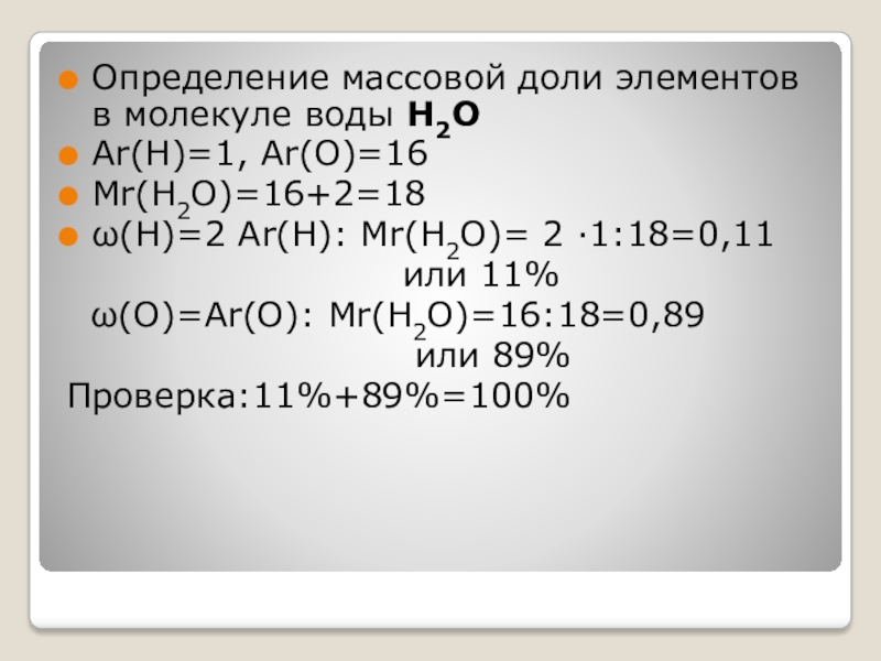 Определение массовой доли элементов в молекуле воды H2OAr(H)=1, Ar(O)=16Mr(H2O)=16+2=18ω(H)=2 Ar(H): Mr(H2O)= 2 ·1:18=0,11