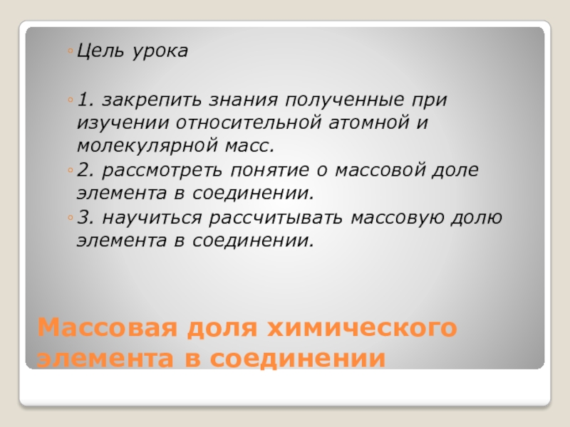 Массовая доля химического элемента в соединенииЦель урока1. закрепить знания полученные при изучении относительной атомной и молекулярной масс.2. рассмотреть понятие о массовой доле элемента в соединении.3. научиться рассчитывать массовую долю элемента в соединении.