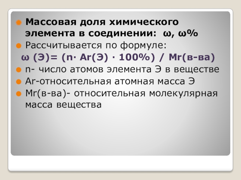 Массовая доля химического элемента в соединении: ω, ω%Рассчитывается по формуле: ω (Э)= (n· Ar(Э) · 100%) / Mr(в-ва) n-