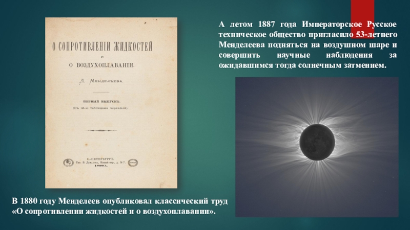 А летом 1887 года Императорское Русское техническое общество пригласило 53-летнего Менделеева подняться на воздушном шаре и совершить научные наблюдения за ожидавшимся тогда солнечным затмением.