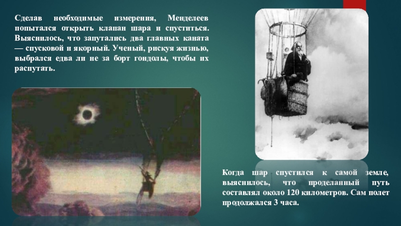 Полет проходил в сложнейших условиях. На высоте 600 метров аэростат оказался над облаками. К этому моменту солнце находилось в полной фазе затмения.