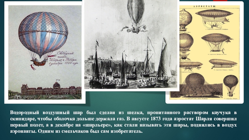 Первым сделал водородный аэростат французский ученый и изобретатель Жак Шарль. Он считал, что дымный воздух быстро теряет подъемную силу, тогда как водород надежнее.