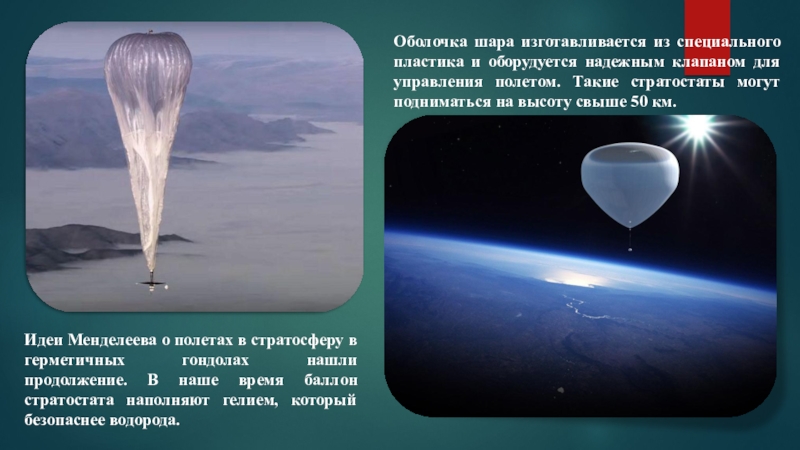 Оболочка шара изготавливается из специального пластика и оборудуется надежным клапаном для управления полетом. Такие стратостаты могут подниматься на высоту свыше 50 км.