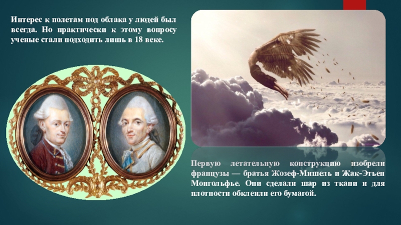Первую летательную конструкцию изобрели французы — братья Жозеф-Мишель и Жак-Этьен Монгольфье. Они сделали шар из ткани и для плотности обклеили его бумагой.