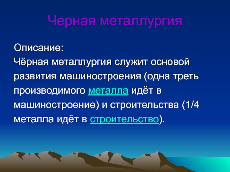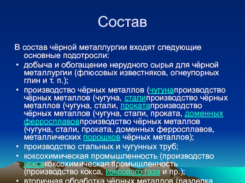 производство чёрных металлов (чугунапроизводство чёрных металлов (чугуна, сталипроизводство чёрных металлов (чугуна, стали, прокатапроизводство чёрных металлов (чугуна, стали, проката, доменных ферросплавовпроизводство чёрных металлов (чугуна, стали, проката, доменных ферросплавов, металлических порошков чёрных металлов);