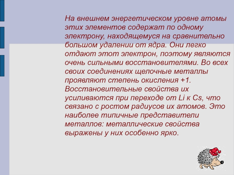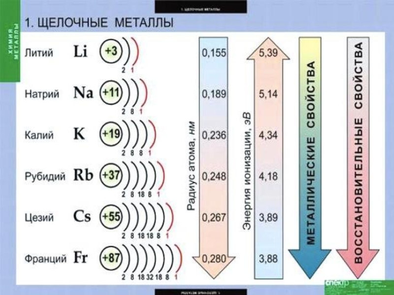 находящемуся на сравнительно большом удалении от ядра. Они легко отдают этот электрон, поэтому являются очень сильными восстановителями. Во всех своих соединениях щелочные металлы проявляют степень окисления +1. Восстановительные свойства их усиливаются при переходе от Li к Сs, что связано с ростом радиусов их атомов. Это наиболее типичные представители металлов: металлические свойства выражены у них особенно ярко.