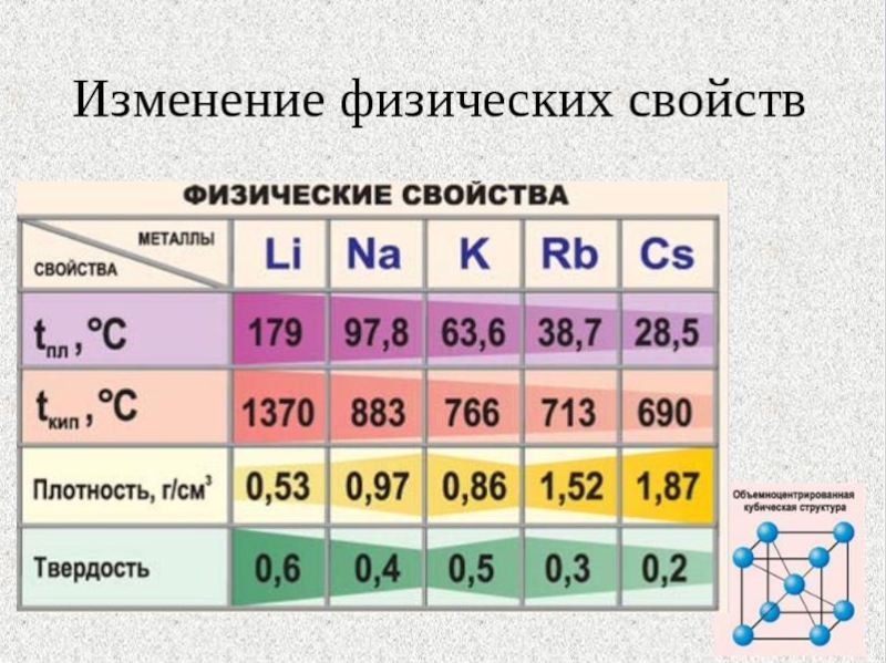 Все они легкие и легкоплавкие, причем, как правило, плотность их возрастает от Li к Сs, а температура плавления, наоборот, уменьшается.