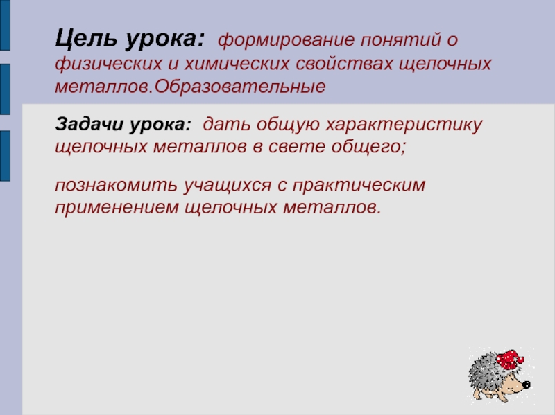Слайд 2Цель урока: формирование понятий о физических и химических свойствах щелочных металлов.Образовательные