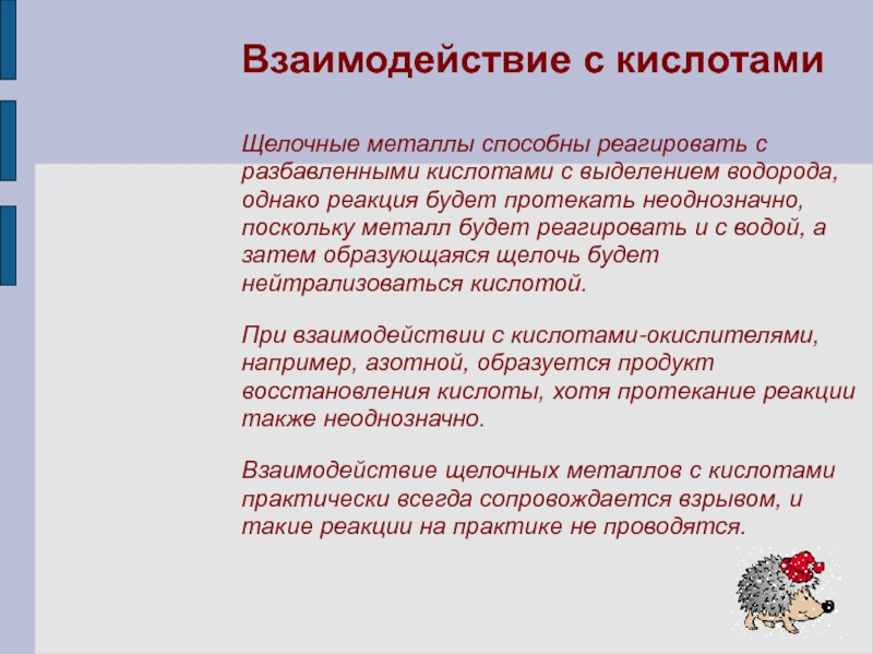 Слайд 19Щелочные металлы способны реагировать с разбавленными кислотами с выделением водорода, однако
