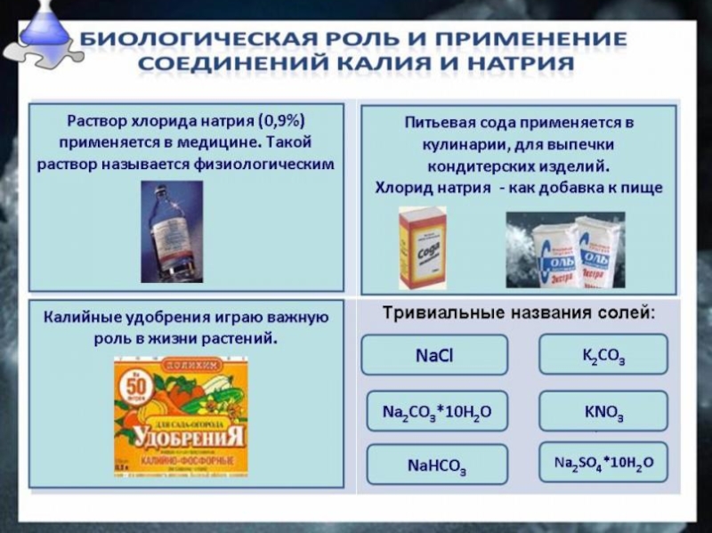 известна из курса прошлого года. Хлорид натрия является важнейшим сырьем в химической промышленности, широко применяется и в быту.