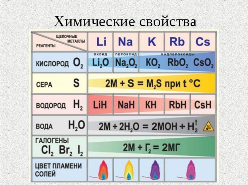 поверхности воды, натрий часто воспламеняется, а калий, рубидий и цезий реагируют со взрывом: