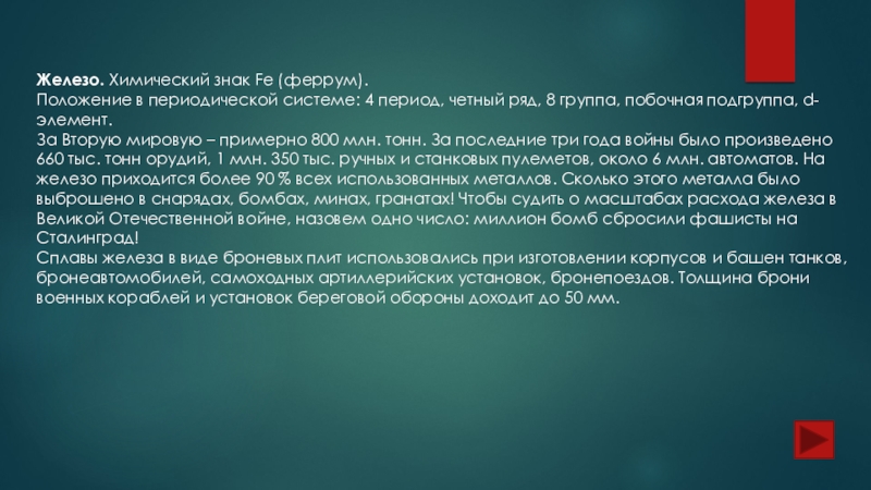 Железо. Химический знак Fe (феррум).Положение в периодической системе: 4 период, четный ряд, 8 группа, побочная подгруппа, d-элемент.За Вторую мировую – примерно 800 млн. тонн. За последние три года войны было произведено 660 тыс. тонн орудий, 1 млн.