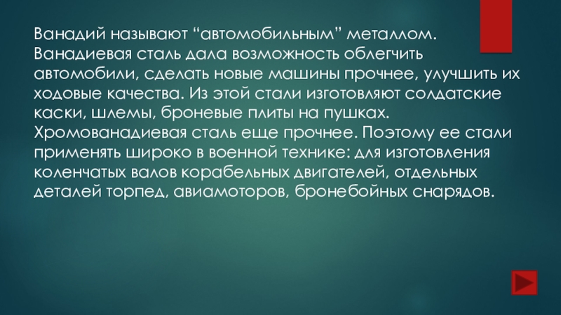 Слайд 6Ванадий называют “автомобильным” металлом. Ванадиевая сталь дала возможность облегчить автомобили, сделать