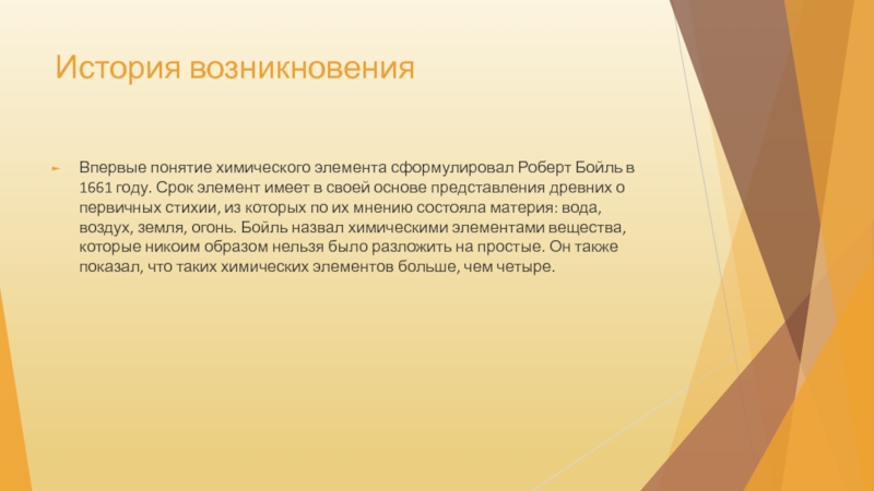 году. Срок элемент имеет в своей основе представления древних о первичных стихии, из которых по их мнению состояла материя: вода, воздух, земля, огонь. Бойль назвал химическими элементами вещества, которые никоим образом нельзя было разложить на простые. Он также показал, что таких химических элементов больше, чем четыре.