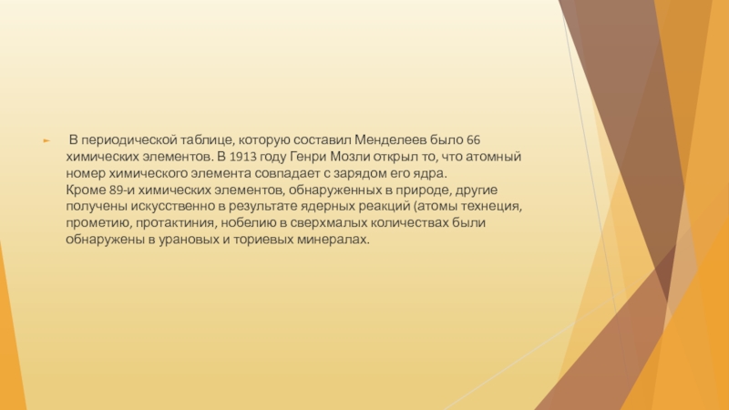 Слайд 8 В периодической таблице, которую составил Менделеев было 66 химических элементов. В