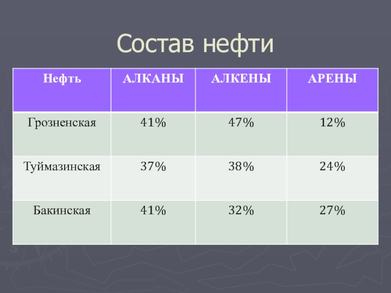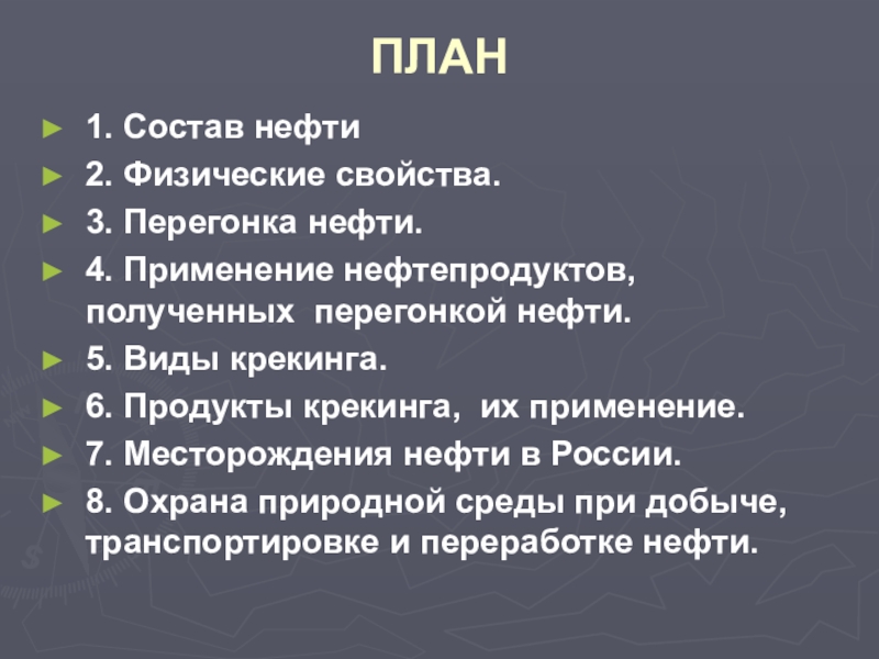 ПЛАН1. Состав нефти2. Физические свойства.3. Перегонка нефти.4. Применение нефтепродуктов, полученных перегонкой нефти.5. Виды крекинга.6. Продукты крекинга, их применение.7. Месторождения нефти в России.8. Охрана природной среды при добыче, транспортировке и переработке нефти.