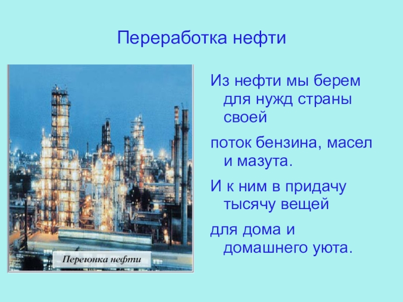 Переработка нефти Из нефти мы берем для нужд страны своейпоток бензина, масел и мазута.И к ним в