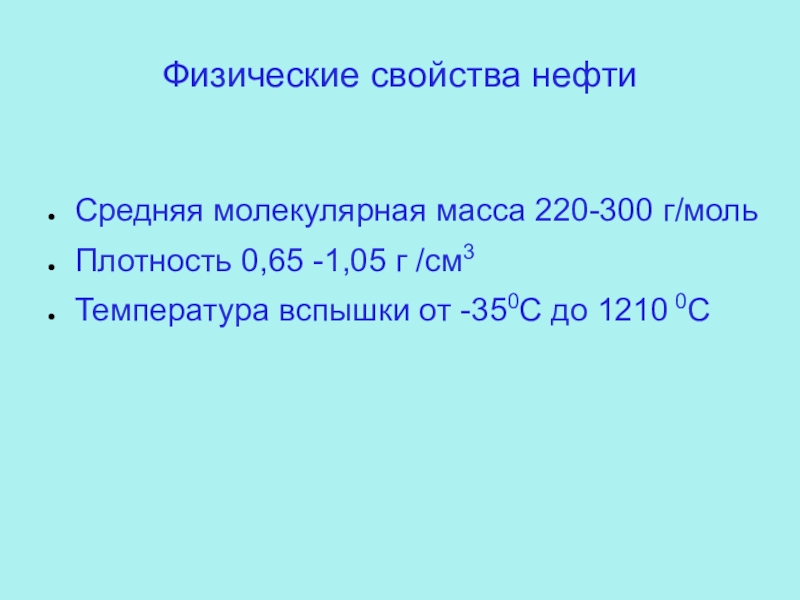 Физические свойства нефти Средняя молекулярная масса 220-300 г/мольПлотность 0,65 -1,05 г /см3Температура вспышки от -350С до 1210
