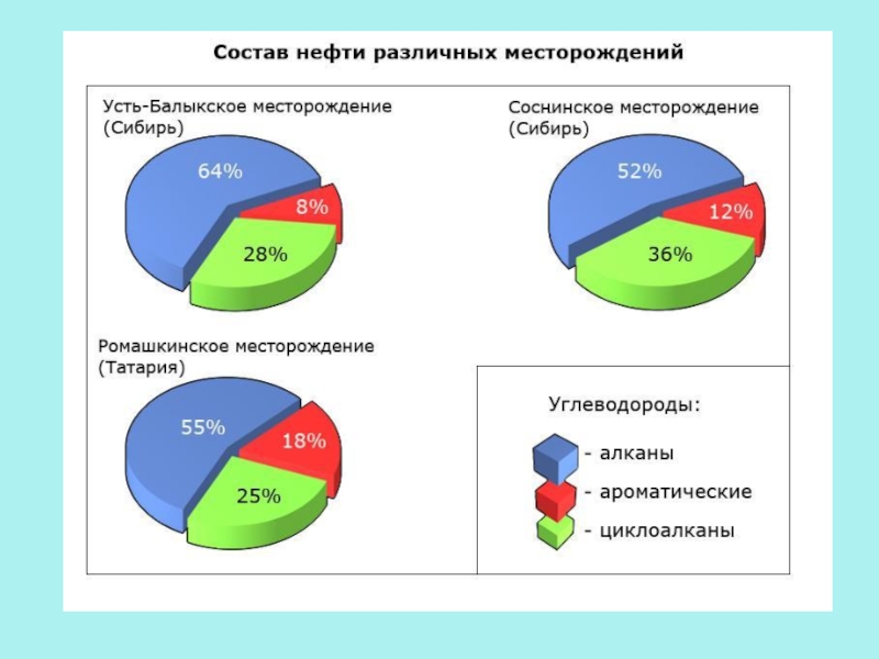 Состав нефти АлканыЦиклопарафиныАроматические углеводородыОрганическая массаC — 83%H — 13 %O и N – 0,2- 0,3 %S —