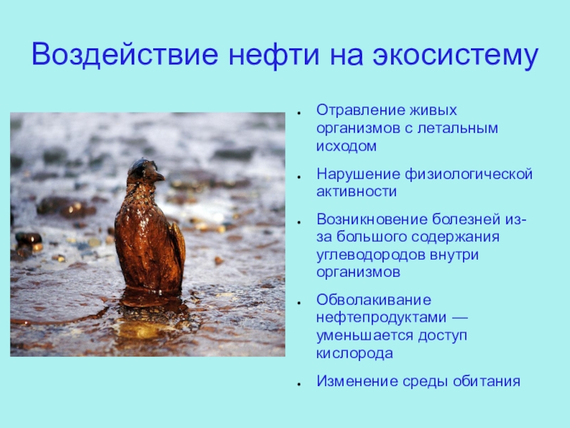 Воздействие нефти на экосистемуОтравление живых организмов с летальным исходомНарушение физиологической активностиВозникновение болезней из-за большого содержания углеводородов внутри