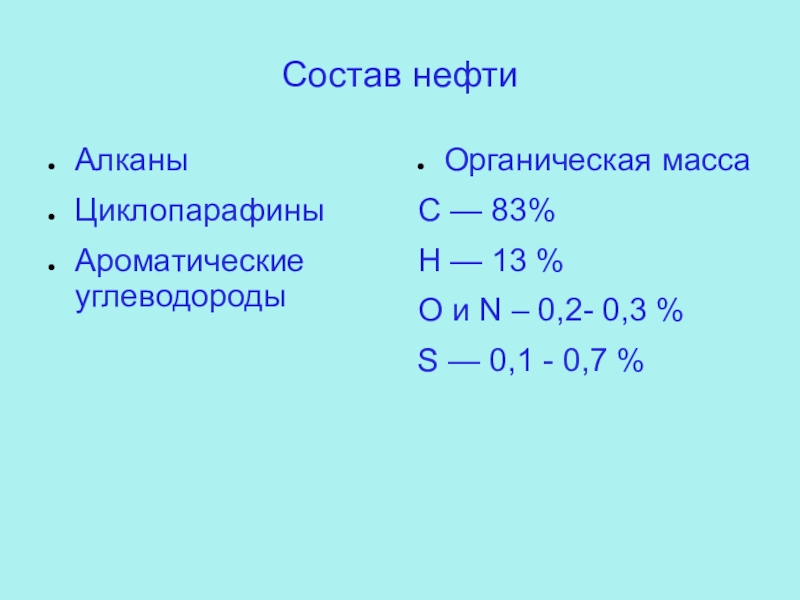 Состав нефти АлканыЦиклопарафиныАроматические углеводородыОрганическая массаC — 83%H — 13 %O и N – 0,2- 0,3 %S — 0,1 - 0,7 %