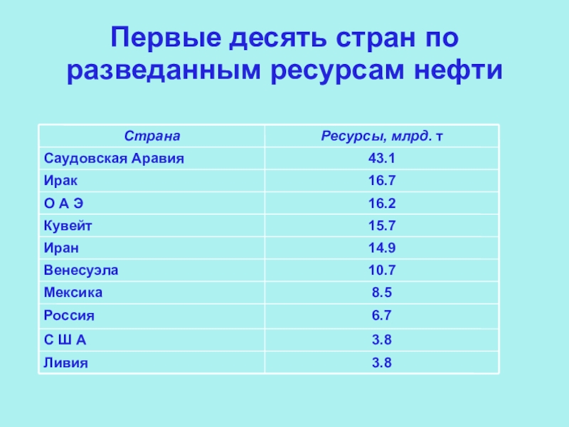 Слайд 6Первые десять стран по разведанным ресурсам нефти