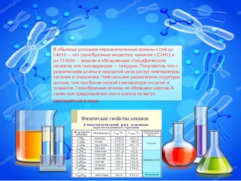 В обычных условиях неразветвленные алканы с CH4 до C4H10 — это газообразные вещества, начиная с С5Н12 и