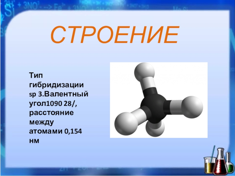 СТРОЕНИЕТип гибридизации sp 3.Валентный угол1090 28/,расстояние между атомами 0,154 нм