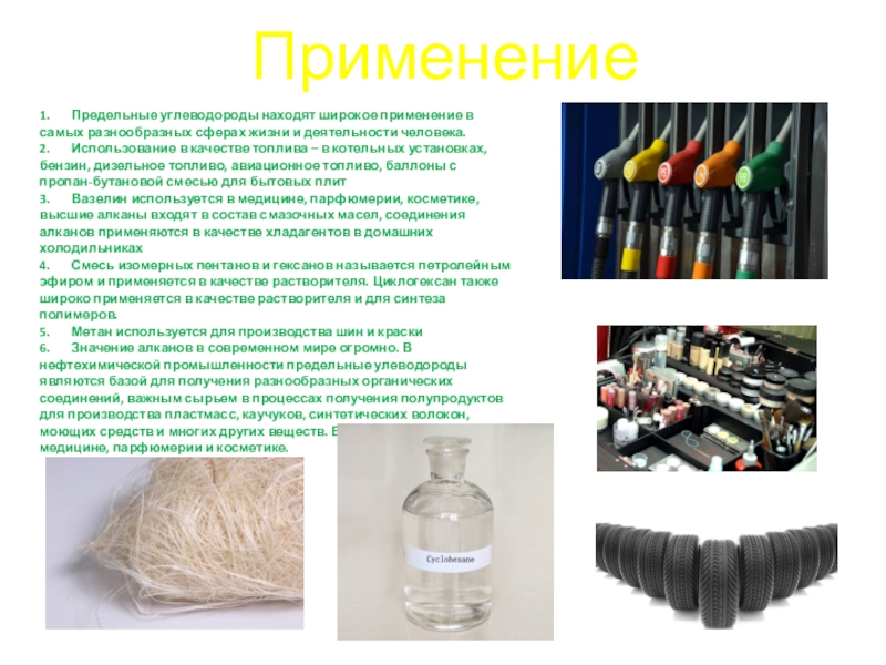 Применение1.    Предельные углеводороды находят широкое применение в самых разнообразных сферах жизни и деятельности человека.2.