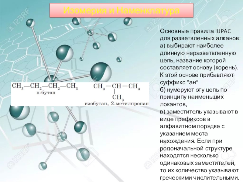 Изомерия и Наменклатура Основные правила IUPAC для разветвленных алканов:а) выбирают наиболее длинную неразветвленную цепь, название которой составляет