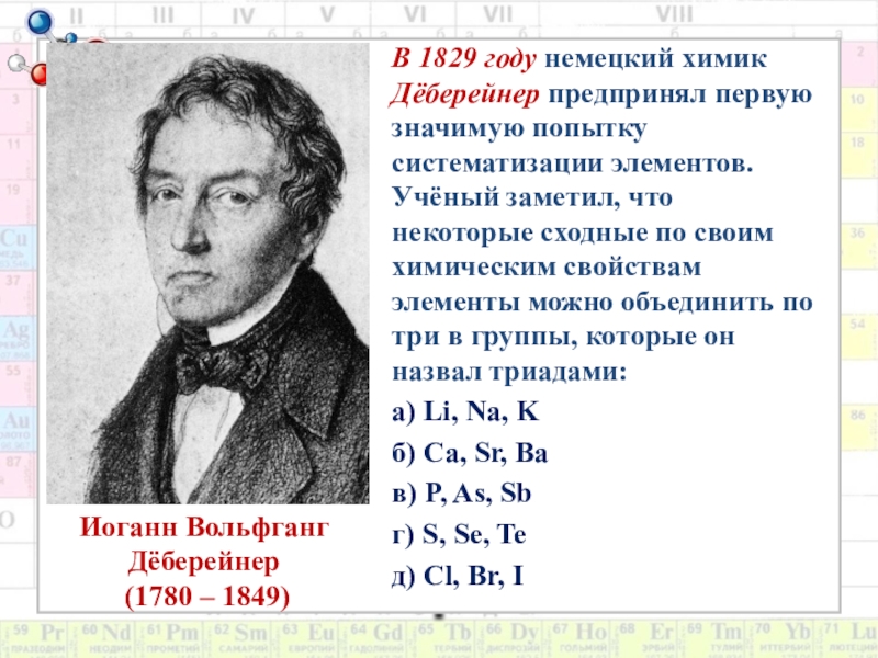 Дёберейнер предпринял первую значимую попытку систематизации элементов. Учёный заметил, что некоторые сходные по своим химическим свойствам элементы можно объединить по три в группы, которые он назвал триадами: