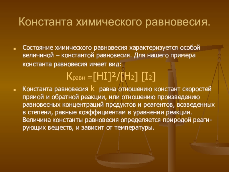 Состояние химического равновесия характеризуется особой величиной – константой равновесия.