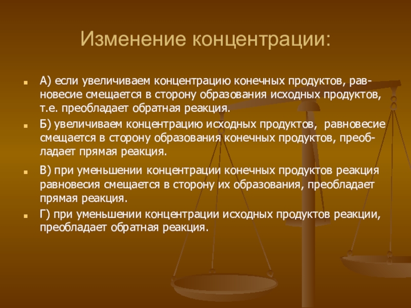 А) если увеличиваем концентрацию конечных продуктов, рав- новесие смещается