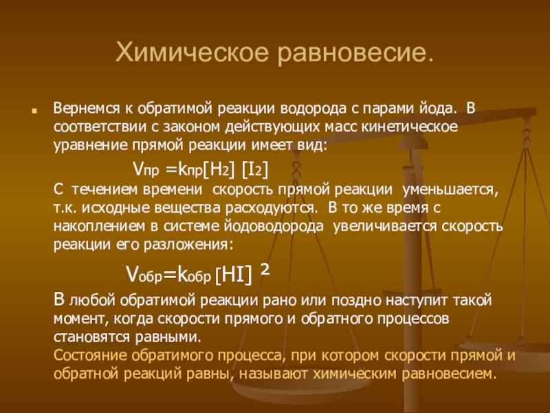 Vобр=kобр [HI] ² В любой обратимой реакции рано или поздно наступит такой момент, когда скорости прямого и обратного процессов становятся равными. Состояние обратимого процесса, при котором скорости прямой и обратной реакций равны, называют химическим равновесием.