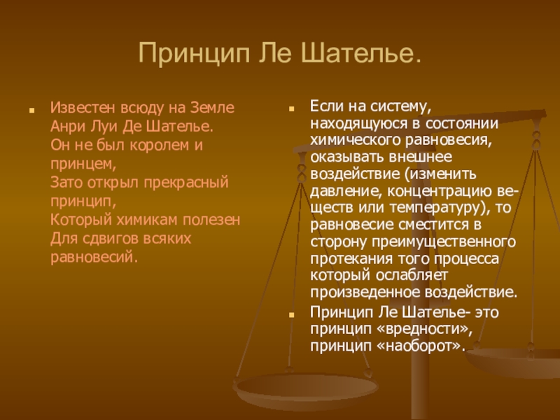 Де Шателье. Он не был королем и принцем, Зато открыл прекрасный принцип, Который химикам полезен Для сдвигов всяких равновесий.