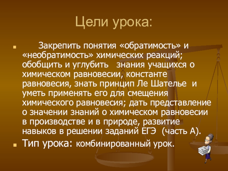 обобщить и углубить знания учащихся о химическом равновесии, константе равновесия, знать принцип Ле Шателье и уметь применять его для смещения химического равновесия; дать представление о значении знаний о химическом равновесии в производстве и в природе, развитие навыков в решении заданий ЕГЭ (часть А).