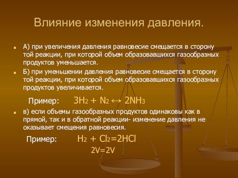 Б) при уменьшении давления равновесие смещается в сторону той реакции, при которой объем образовавшихся газообразных продуктов увеличивается.
